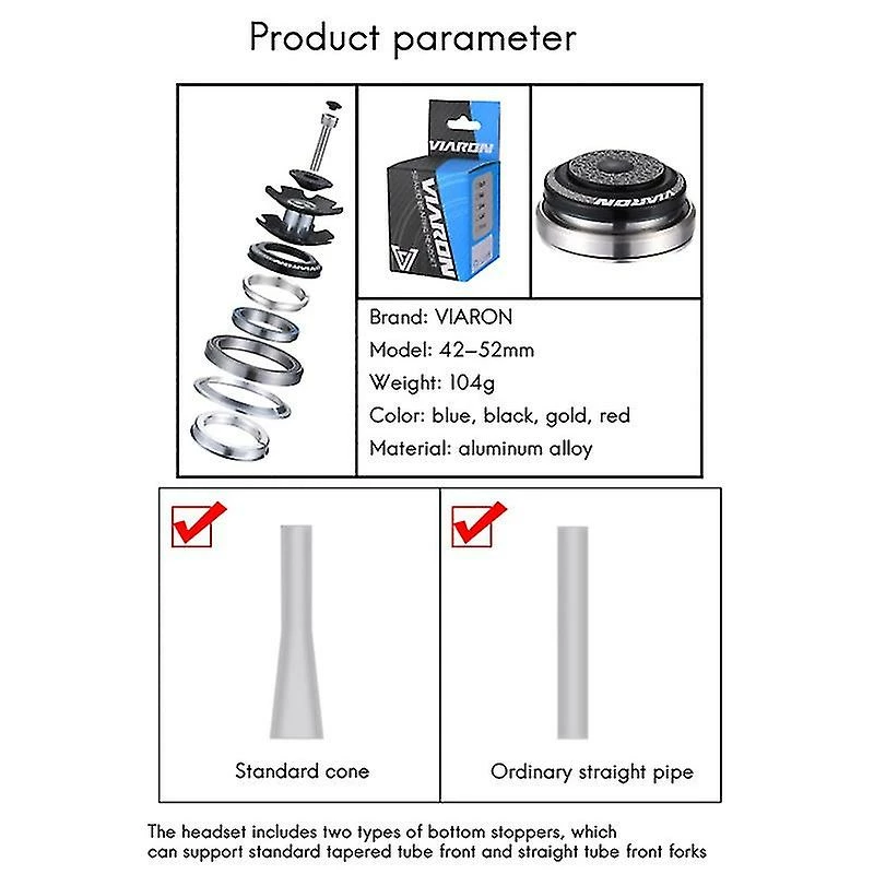 This headset has an aluminum alloy structure that can provide excellent stability. Double bearing design to ensure smooth and noise-free steering performance.Bike headset set can prevent the bearing from over-abrasion and make it rotate freely. The cover is good for keeping dust and water away to lengthen the durability.Made of high quality aluminum alloy material, the product is wear-resistant, sturdy and durable.It is suitable for mountain bikes.Item Name: Bearing HeadsetFeatures: High Strength, High Hardness, Lightweightcolour: goldMaterial: aluminum alloySize: 42x52mmPackage Contents:1 x Bearing HeadsetOnly the above package content, other products are not included.Note: Light shooting and different displays may cause the color of the item in the picture a little different from the real thing. The measurement allowed error is +/- 1-3cm.